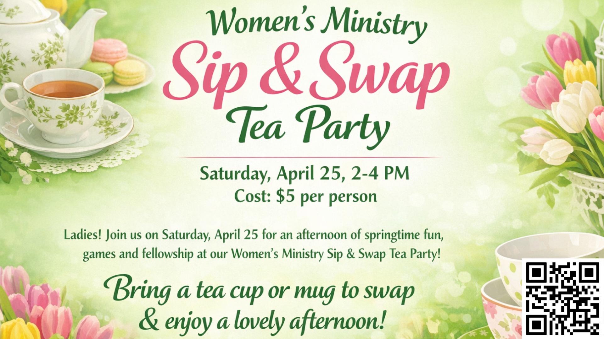 Ladies! Join us on Saturday, April 25th for an afternoon of springtime fun, games and fellowship at our Women's Ministry Sip & Swap Tea Party!